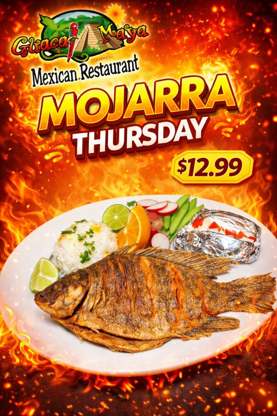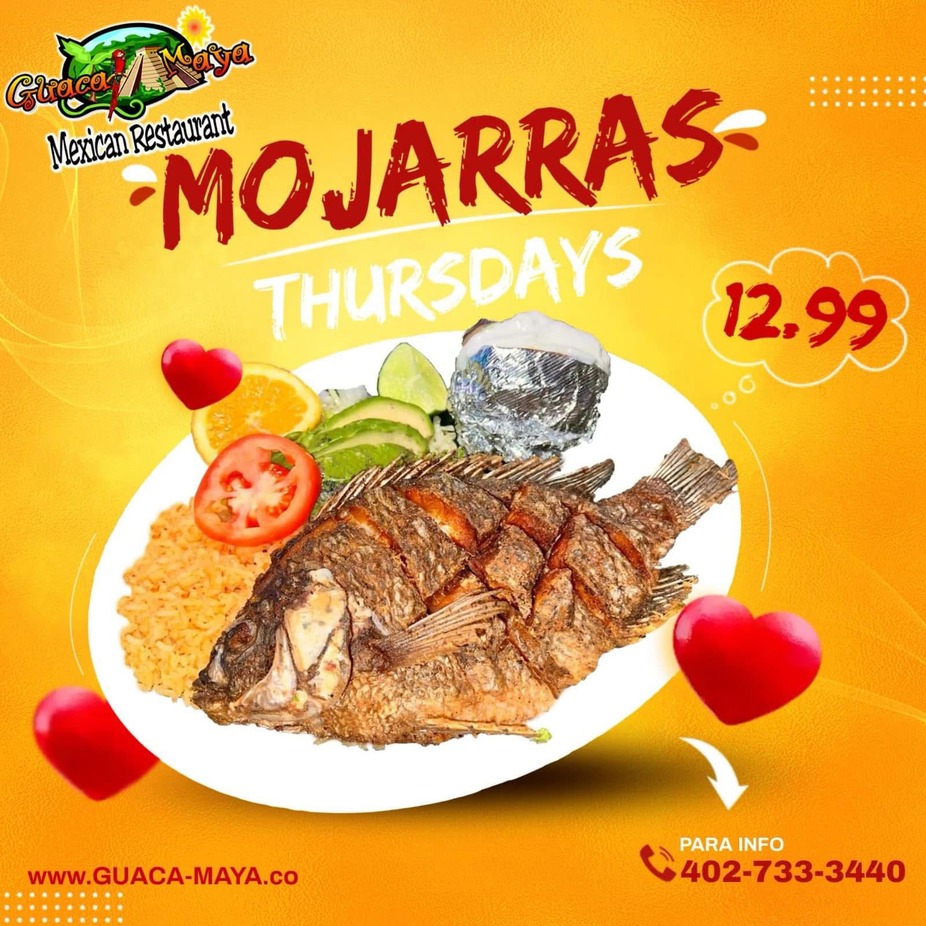 🔥🐟 MOJARRA THURSDAYS! 🐟🔥 Join us every Thursday for a delicious fried whole tilapia served with rice and sides for just $12.99 😍 Crispy on the outside, juicy on the inside… just the way it should be! 🤤 📍 Visit Guaca Maya 📞 402-733-3440 Tag someone who owes you a mojara this Thursday 👇🔥 #MojarraThursdays #GuacaMaya #OmahaFood #MexicanCuisine