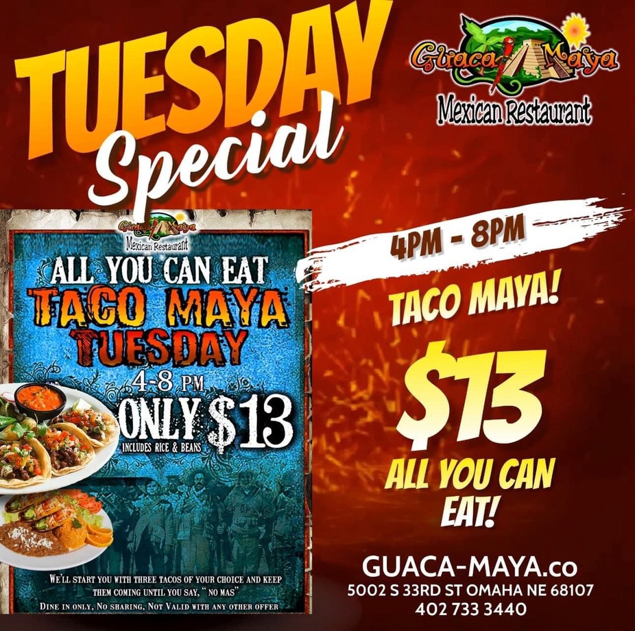 🌮🔥 ALL YOU CAN EAT TACO MAYA TUESDAY 🔥🌮 Omaha… are you hungry or what? 👀 Join us every Tuesday from 4PM–8PM for 🌮 UNLIMITED TACOS 🍚 Includes rice & beans 💲 Only $13 We start you with 3 tacos of your choice… and we keep them coming until you say “NO MÁS” 😮🔥 Dine-in only. No sharing. Come ready. 📍 Guaca Maya – Omaha Tag your taco partner that never says “no más” 😏👇 #TacoTuesday #GuacaMaya #AllYouCanEat #OmahaEats #MartesDeTacos