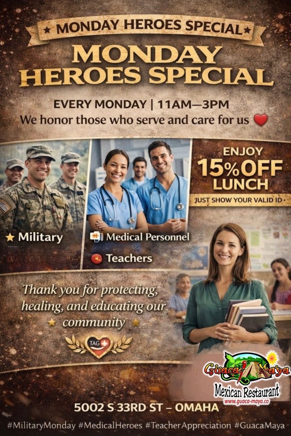 MONDAY HEROES SPECIAL Every Monday | 11AM–3PM We honor those who serve and care for us ❤️ 🎖 Military 🚑 Medical Personnel 🍎 Teachers Enjoy 15% OFF lunch Just show your valid ID. Thank you for protecting, healing, and educating our community. 📍 Guaca Maya – Omaha Tag a hero who deserves this 👏🇺🇸🍽️ #MilitaryMonday #MedicalHeroes #TeacherAppreciation #GuacaMaya